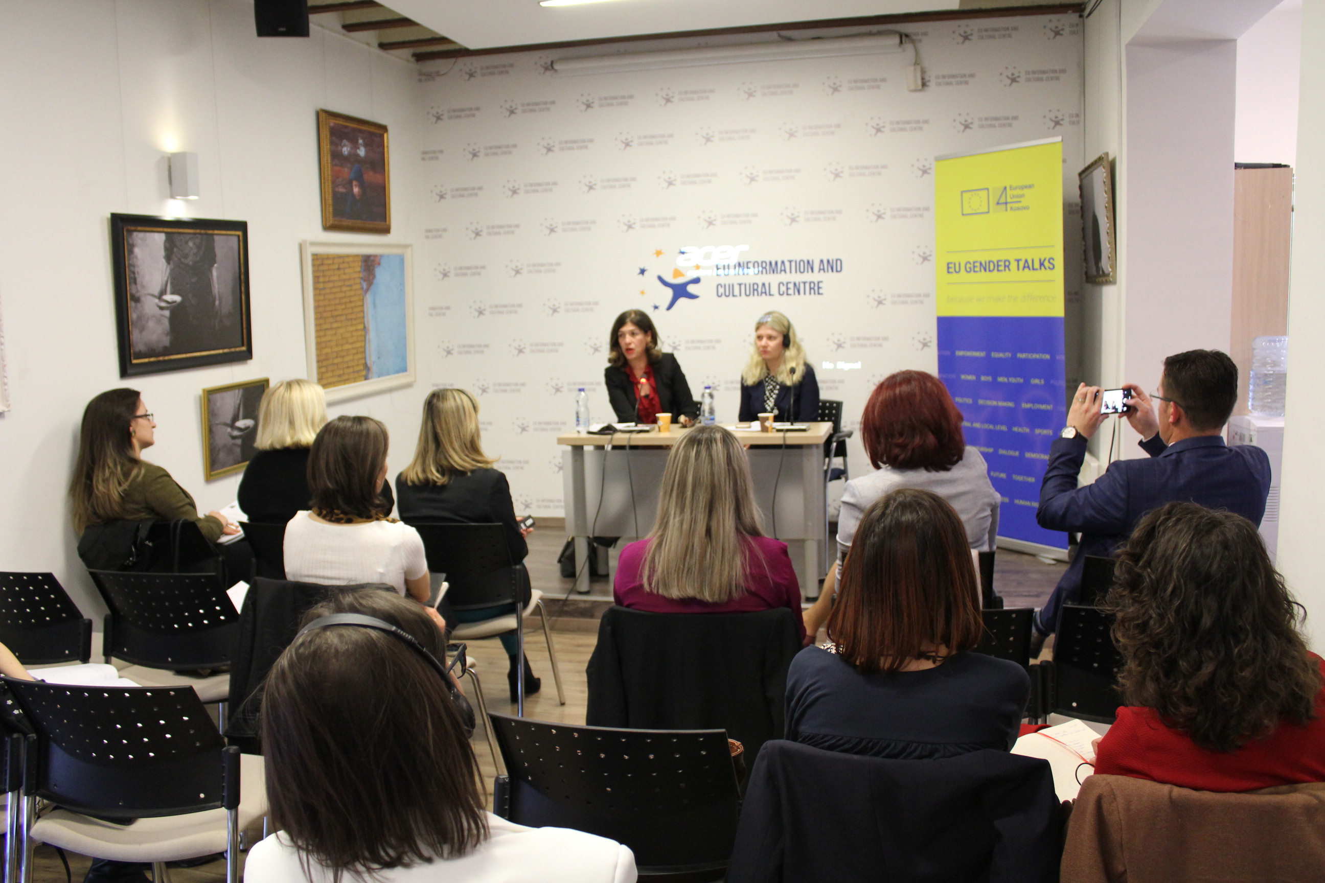 The third event in the framework of ‘EU Gender Talks’ was held at the EUICC in Pristina on the 25th of March, with Dr. Annette M. Fath Lihic, Chief Political Adviser/Executive Coordinator, EUO/EUSR and Valdete Daka, Chairperson of the Central Electoral Commission as speakers.