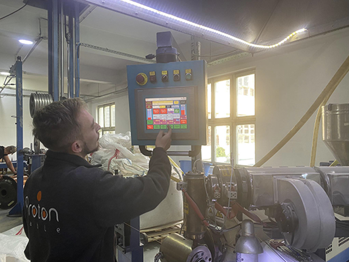Serhat Morina working with the modern equipment at Proton Cable Factory