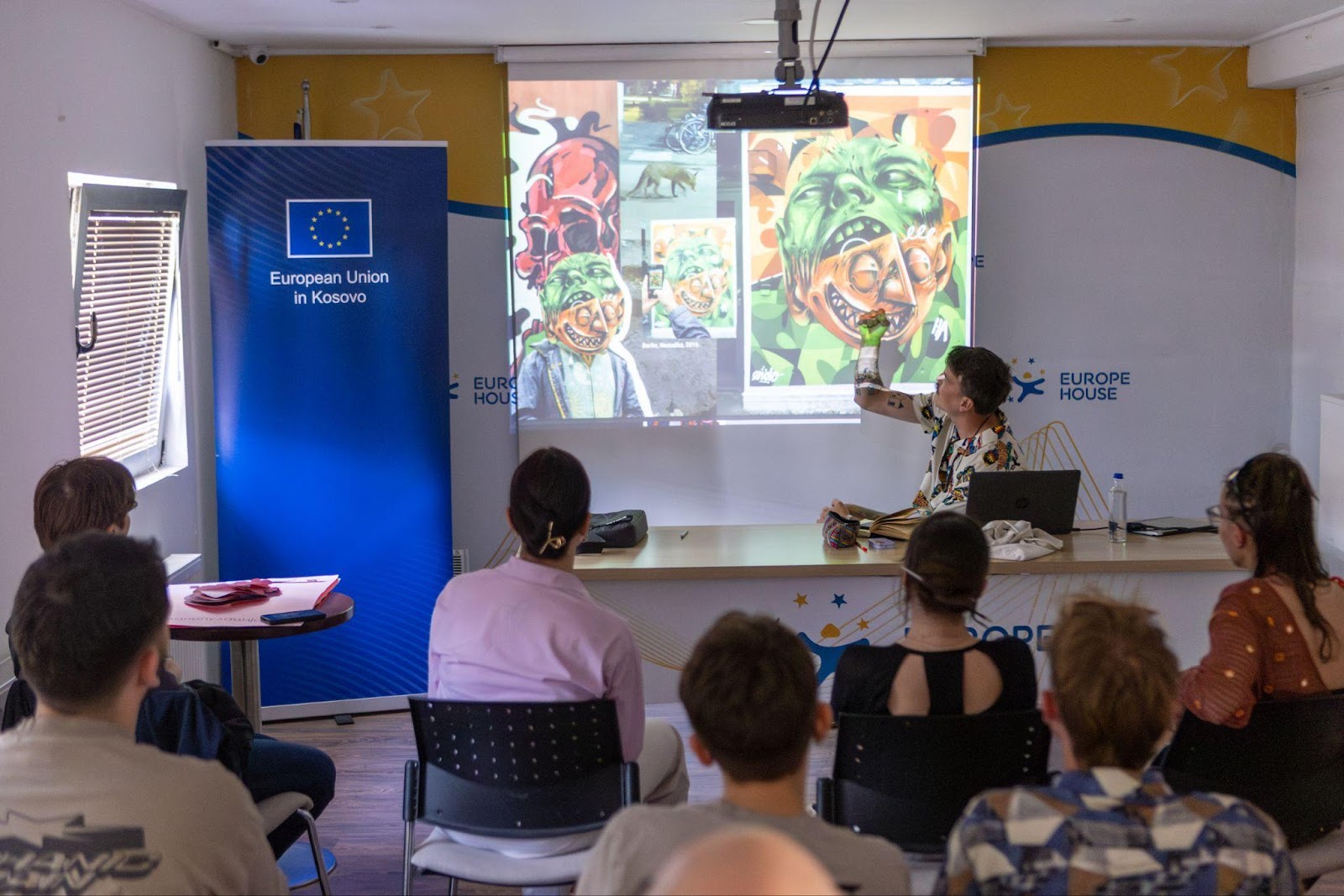 Led by muralist Vuk Ðurić, the masterclass took place in Europe House Mitrovica North and culminated with the unveiling of the mural on May 9 in Mitrovica North, conveying messages of unity and cooperation.