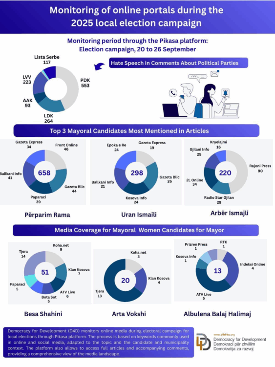 Paralelno, D4D prati 125 onlajn portala, uključujući 107 medija na albanskom i 18 na srpskom jeziku. Praćenje ima dva glavna cilja: identifikaciju govora mržnje i diskriminatornog sadržaja usmerenog na kandidate i analizu medijske vidljivosti praćenjem pominjanja kandidata u onlajn izveštavanju.